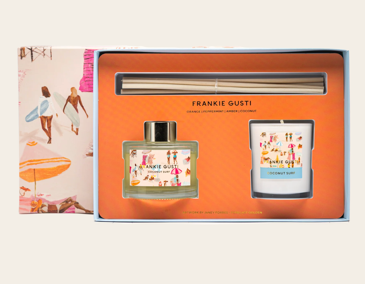 Gifting just got easy with the Candle and Diffuser Duo from Frankie Gusti. Delightfully scented and beautifully packaged featuring artwork by Janey Forbes, this duo features a 100ml diffuser and a 100gm candle.